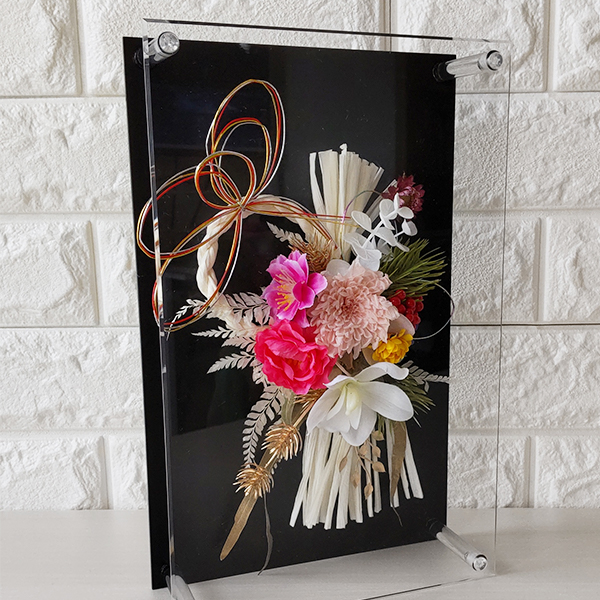 黒アクリルベースにしめ縄を飾り付け、透明アクリルでカバーした置き型タイプのしめ縄です。